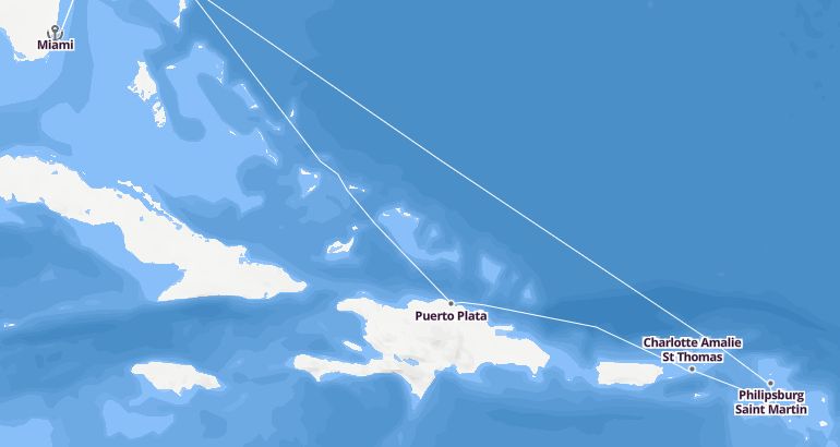 Itinerary: Miami, Fun day at sea, Fun day at sea, Philipsburg Saint Martin, Basseterre, Charlotte Amalie St Thomas, Puerto Plata, Fun day at sea, Miami