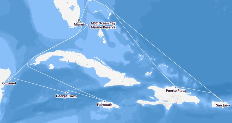 Itinerary: Miami, MSC Ocean Cay Marine Reserve, Fun day at sea, Fun day at sea, San Juan, Puerto Plata, Fun day at sea, Miami, MSC Ocean Cay Marine Reserve, Fun day at sea, Falmouth, George Town, Cozumel, Fun day at sea, Miami