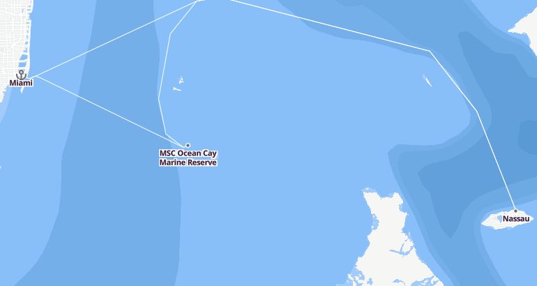 See the routeItinerary: Miami, MSC Ocean Cay Marine Reserve, MSC Ocean Cay Marine Reserve, Nassau, Miami