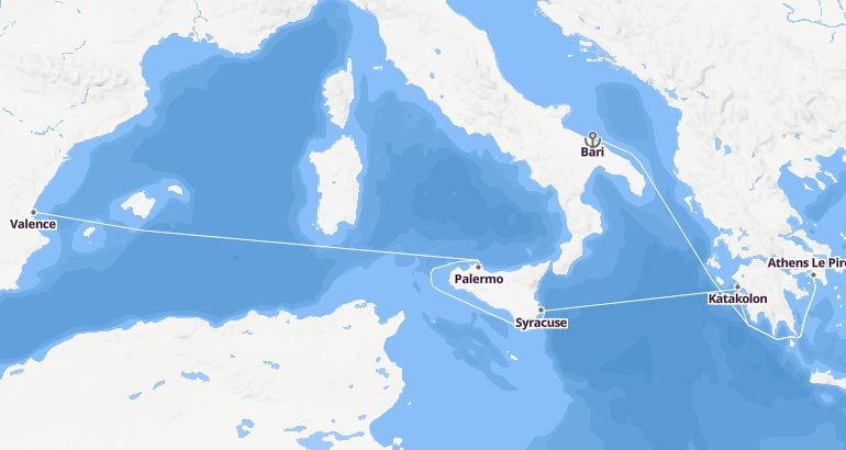 Itinerary: Bari, Fun day at sea, Athens Le Piree, Katakolon, Fun day at sea, Rome Civitavecchia, Fun day at sea, Valence