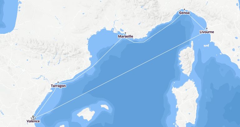 See the routeItinerary: Valence, Tarragon, Marseille, Genoa, Livourne, Fun day at sea, Valence