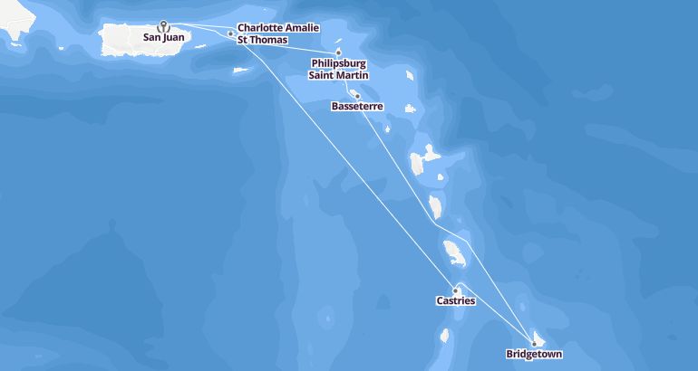 Itinerary: San Juan, Philipsburg Saint Martin, Basseterre, Bridgetown, Castries, Charlotte Amalie St Thomas, Tortola, San Juan