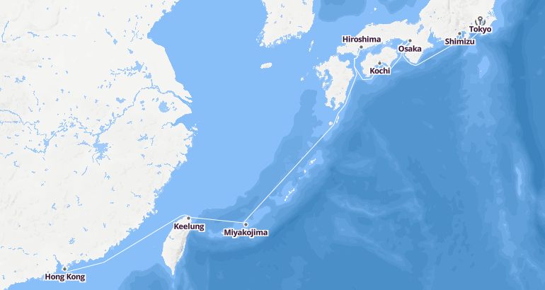 Itinerary: Tokyo, Shimizu, Osaka, Kochi, Hiroshima, Fun day at sea, Miyakojima, Keelung, Fun day at sea, Hong Kong