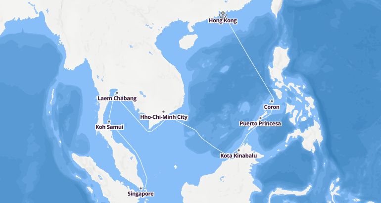 Itinerary: Hong Kong, Fun day at sea, Coron, Puerto Princesa, Kota Kinabalu, Muara, Fun day at sea, Hho-Chi-Minh City, Fun day at sea, Laem Chabang, Koh Samui, Fun day at sea, Singapore