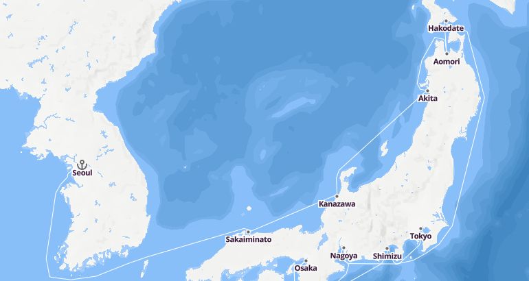 Itinerary: Seoul, Fun day at sea, Sakaiminato, Kanazawa, Akita, Aomori, Hakodate, Fun day at sea, Shimizu, Osaka, Nagoya, Tokyo
