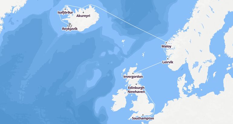 Itinerary: Reykjavík, Isafjörður, Akureyri, Fun day at sea, Maloy, Leirvik, Fun day at sea, Invergordon, Edinburgh Newhaven, Fun day at sea, Southampton