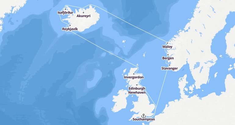 Itinerary: Southampton, Fun day at sea, Edinburgh Newhaven, Invergordon, Fun day at sea, Reykjavík, Reykjavík, Isafjörður, Akureyri, Fun day at sea, Maloy, Bergen, Stavanger, Fun day at sea, Southampton