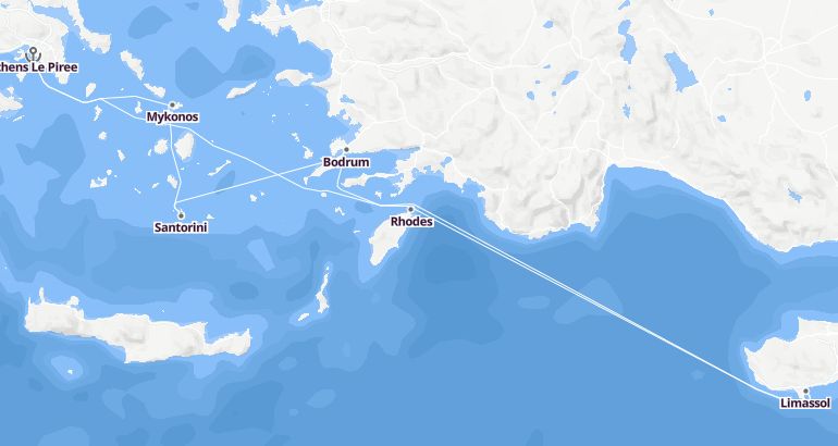 Itinerary: Athens Le Piree, Rhodes, Limassol, Fun day at sea, Bodrum, Santorini, Mykonos, Athens Le Piree