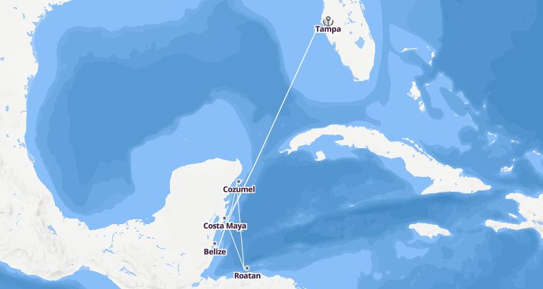 Itinerary: Tampa, Fun day at sea, Belize, Cozumel, Roatan, Costa Maya, Fun day at sea, Tampa