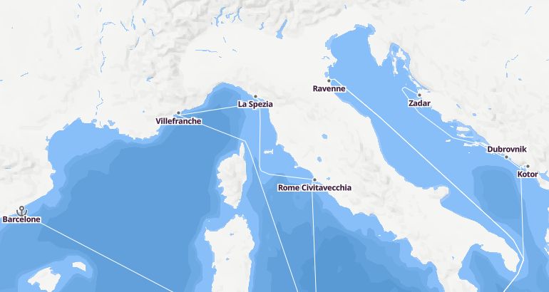 Itinerary: Barcelone, Fun day at sea, Villefranche, La Spezia, Rome Civitavecchia, Fun day at sea, Dubrovnik, Kotor, Zadar, Ravenne
