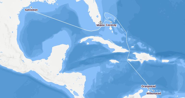 Itinerary: Miami, Cococay, Fun day at sea, Fun day at sea, Willemstad, Oranjestad, Fun day at sea, Fun day at sea, Fun day at sea, Galveston