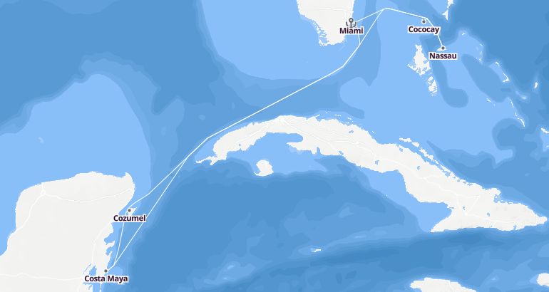 Itinerary: Miami, Nassau, Cococay, Fun day at sea, Costa Maya, Cozumel, Fun day at sea, Miami