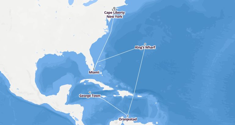 Itinerary: Cape Liberty New York, Fun day at sea, King’s Wharf, Fun day at sea, Fun day at sea, Oranjestad, Fun day at sea, George Town, Fun day at sea, Miami