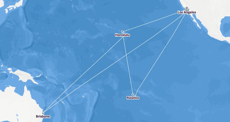 Itinerary: Los Angeles, Santa Catalina Island, Fun day at sea, Fun day at sea, Fun day at sea, Fun day at sea, Fun day at sea, Kailua Kona, Honolulu, Honolulu, Fun day at sea, Fun day at sea, Fun day at sea, Fun day at sea, Fun day at sea, Raiatea, Papeete, Moorea, Fun day at sea, Fun day at sea, International date line, Fun day at sea, Fun day at sea, Fun day at sea, Fun day at sea, Fun day at sea, Brisbane