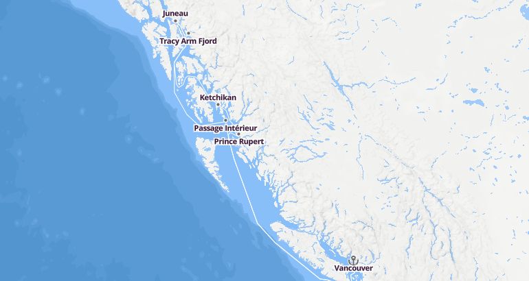 Itinerary: Vancouver, Passage Intérieur, Tracy Arm Fjord, Juneau, Ketchikan, Prince Rupert, Fun day at sea, Vancouver